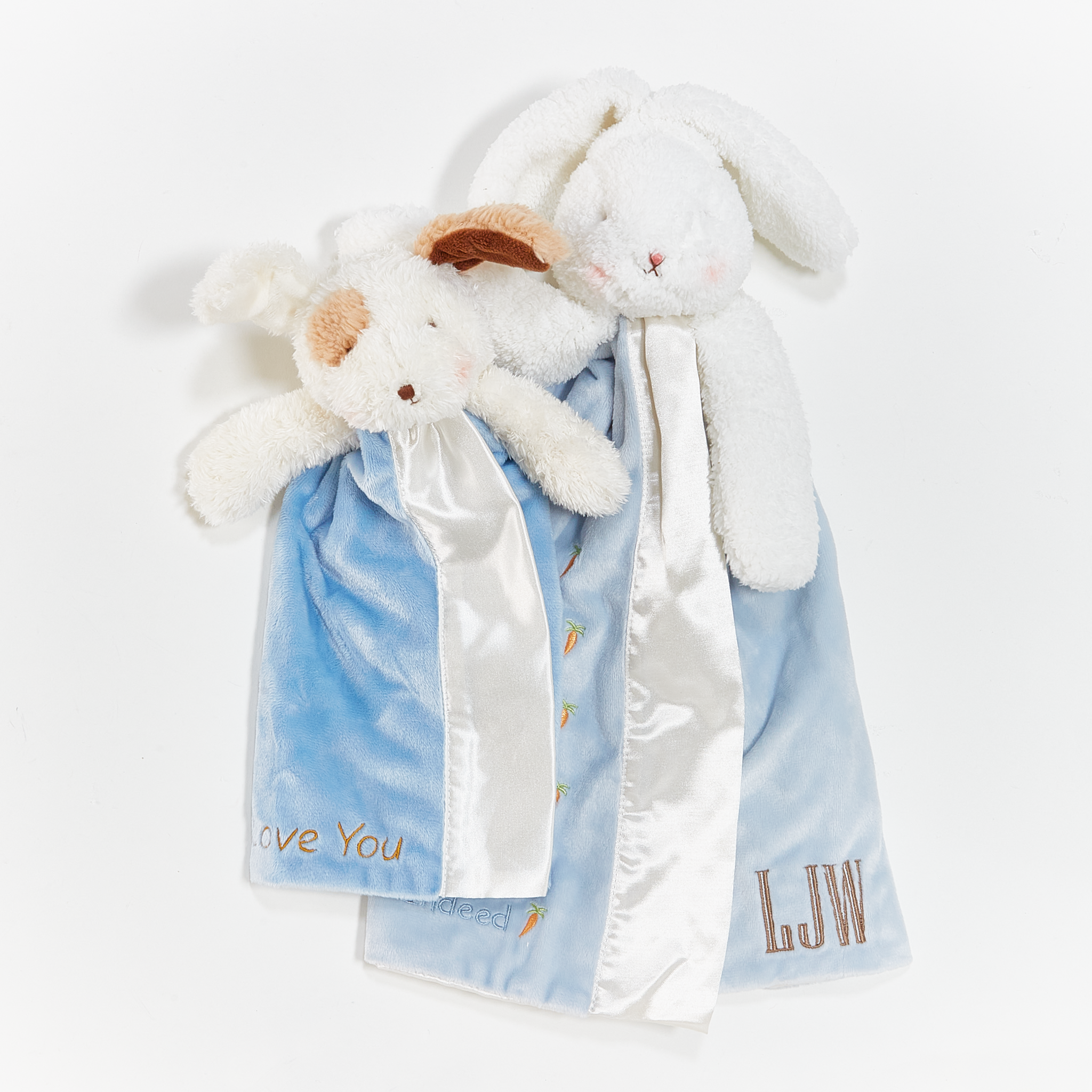 A smaller version of our best-loved Buddy Blanket. this lovie is ready to be on the go. With a handy loop on the back to attach to the car seat. stroller or crib you’re sure to never be left without this precious friend again. This favorite security blanket is a plush floppy-eared puppy with a hand crafted. baby-safe embroidered face and a snuggly soft blue velour split blanket. lined and edged in silky white satin for safe and easy snuggling. Signature three carrot tag for little one’s fingers.
